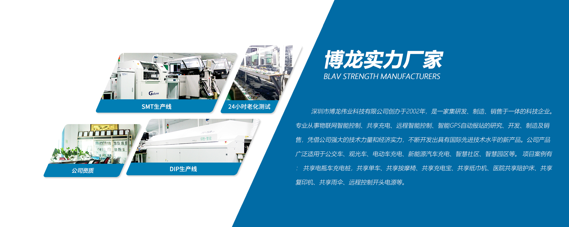深圳市博龍偉業(yè)科技有限公司創(chuàng)辦于2002年,是一家集研發(fā)、制造、銷(xiāo)售于一體的科技企業(yè)。專(zhuān)業(yè)從事物聯(lián)網(wǎng)智能控制、共享充電、遠(yuǎn)程智能控制、智能GPS自動(dòng)報(bào)站的研究、開(kāi)發(fā)、制造及銷(xiāo)售,憑借公司強(qiáng)大的技術(shù)力量和經(jīng)濟(jì)實(shí)力,不斷開(kāi)發(fā)出具有國(guó)際先進(jìn)技術(shù)水平的新產(chǎn)品。公司產(chǎn)品廣泛適用于公交車(chē)、觀(guān)光車(chē)、電動(dòng)車(chē)充電、新能源汽車(chē)充電、智慧社區(qū)、智慧園區(qū)等。 項(xiàng)目案例有: 共享電瓶車(chē)充電樁,共享單車(chē)、共享按摩椅、共享充電寶、共享紙巾機(jī)、醫(yī)院共享陪護(hù)床、共享復(fù)印 機(jī)、共享雨傘、遠(yuǎn)程控制開(kāi)頭電源等。